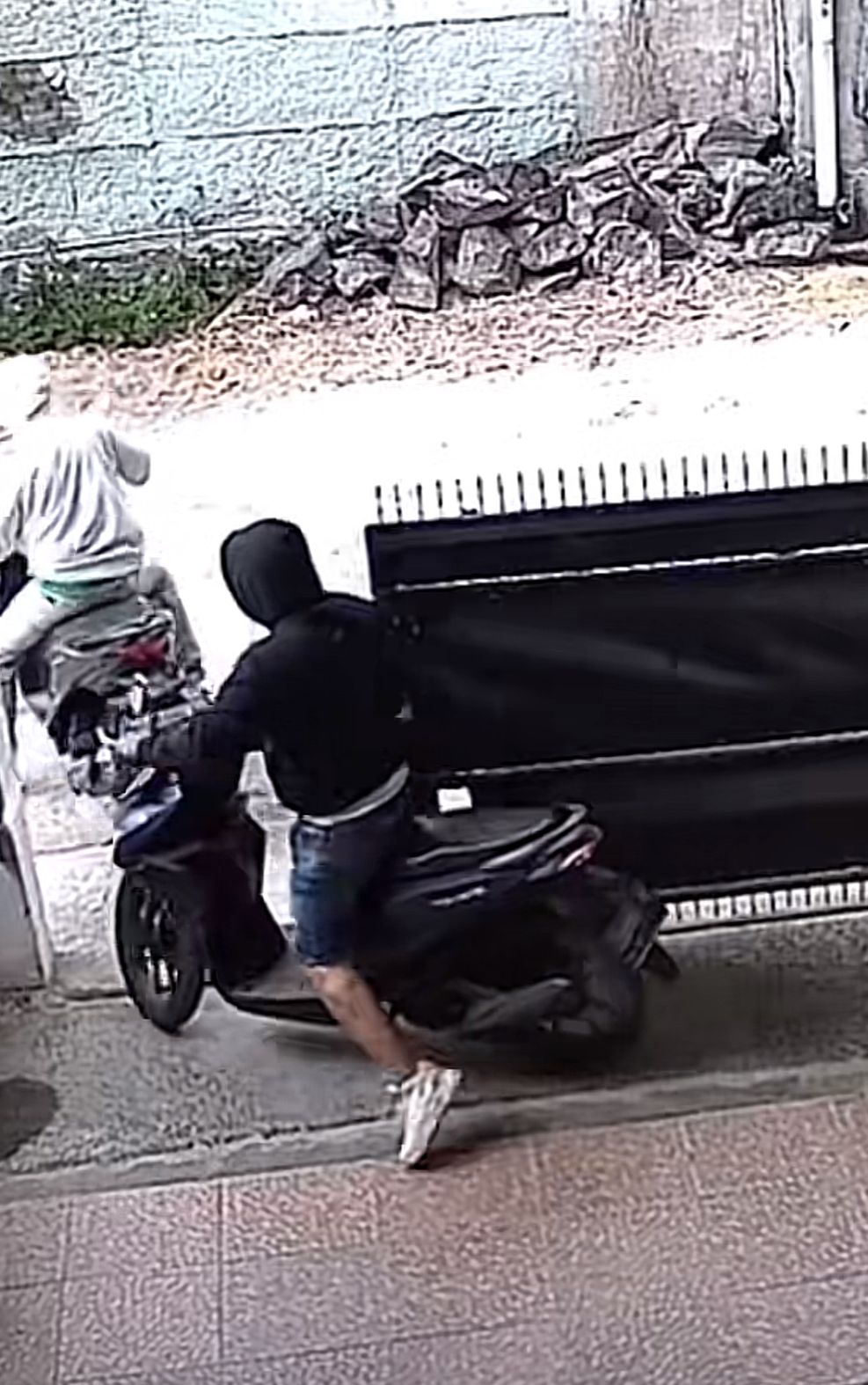 Sementara itu, pelaku pertama yang mengenakan hoodie hitam mengeluarkan motor Honda Beat. Mereka berdua segera melarikan diri dengan masing-masing motor, diikuti oleh mobil yang mereka gunakan tetapi melalui rute yang berbeda.